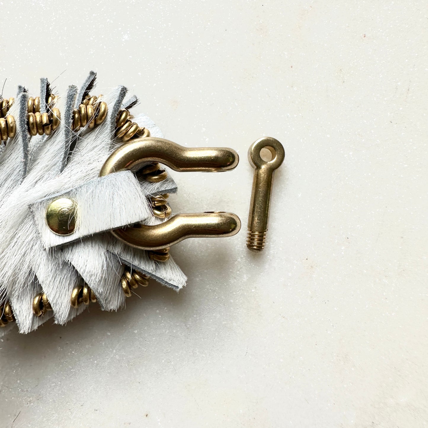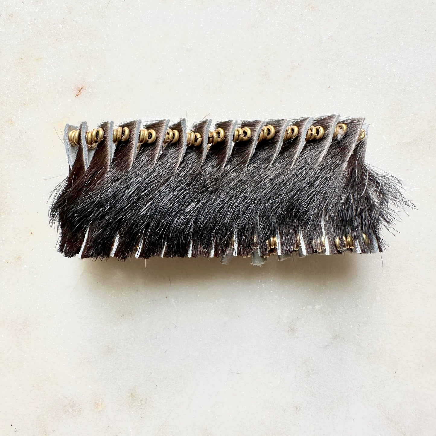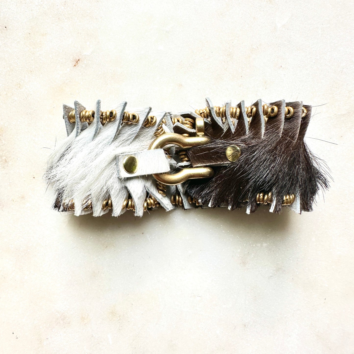 White and Black Hair-on Hide Leather Beaded Bracelet is made with repurposed leather, African brass beads with a solid brass horseshoe shackle clasp.
